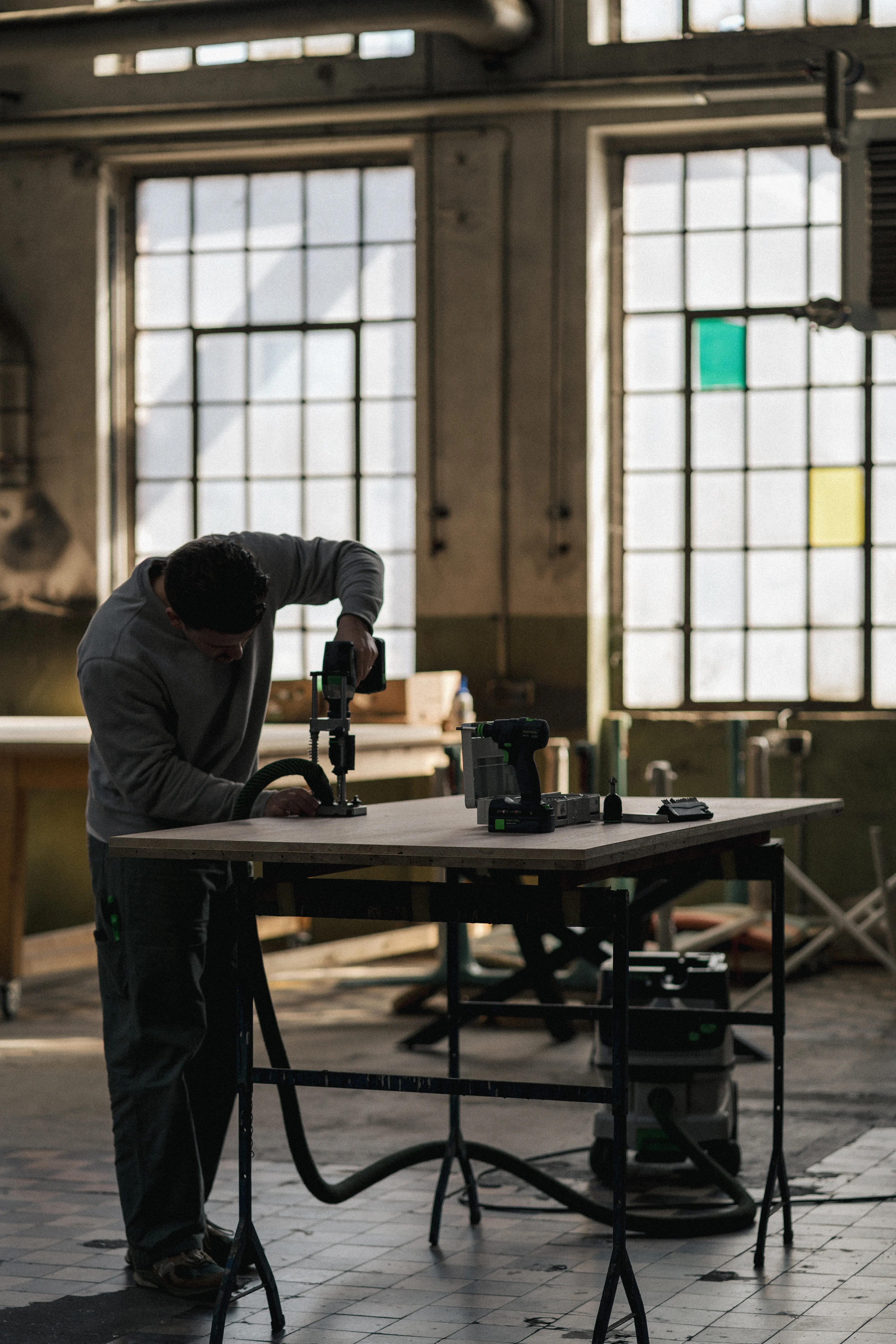 Bei mir findet man tatsächlich auch nur Werkzeug von Festool, von Exzenterschleifer über Tauchsäge und Akkuschrauber bis hin zu den Oberfräsen. Ich finde es einfach schön, dass das alles ein System ist und die Tools auch sinnvoll und wertig sind, deswegen wurde das Geld am Anfang immer direkt in neue Maschinen investiert und ich bereue es nicht, denn es macht einfach Sinn. Wir arbeiten jetzt zu dritt hier, wir haben vernünftiges Werkzeug und es geht nichts kaputt, das wird auch wertgeschätzt. Mir war es von Anfang an sehr wichtig, dass wir mit qualitativ hochwertigem Werkzeug arbeiten können und da ist Festool einfach unschlagbar.