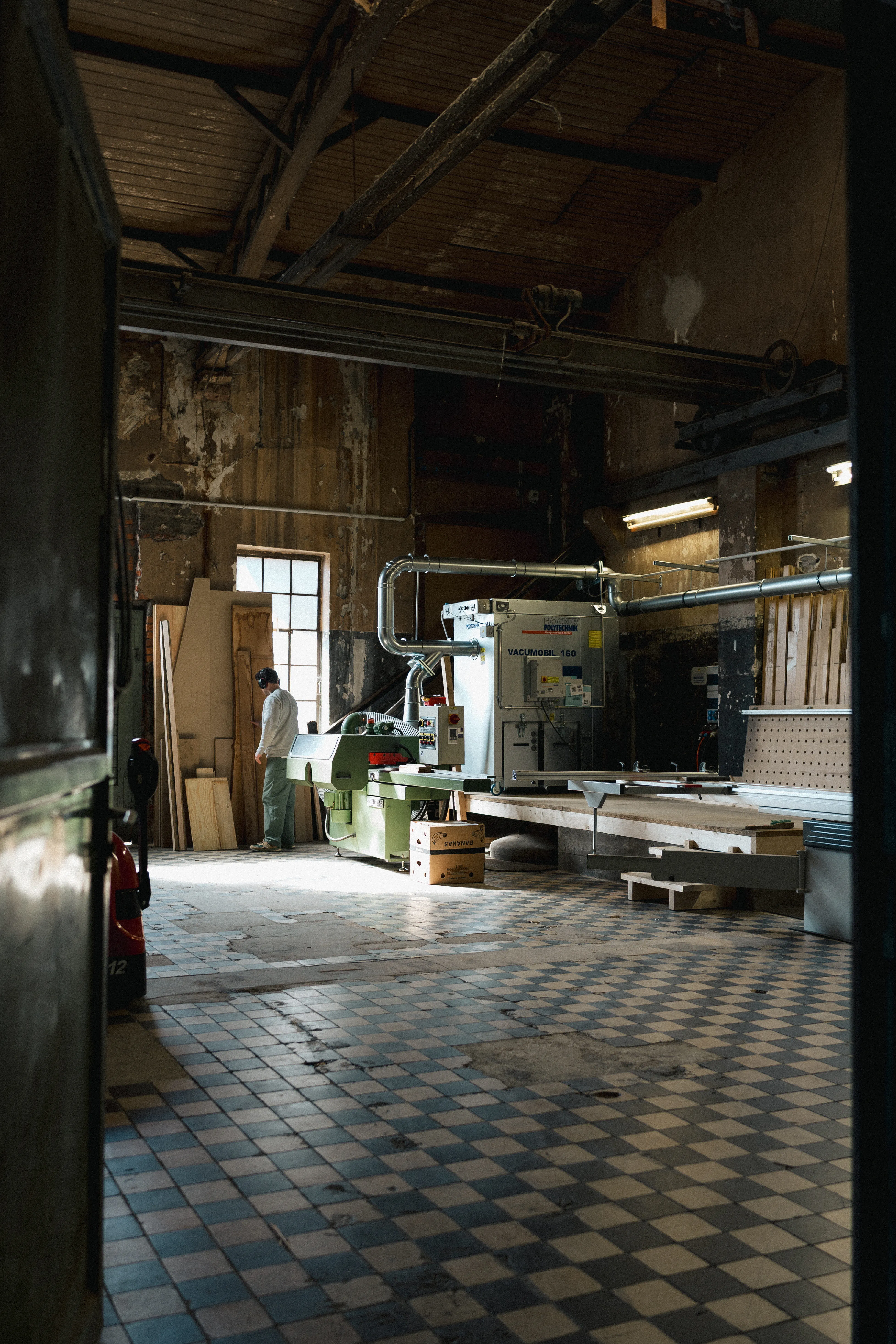 Die Halle, in der wir heute fertigen, fand ich tatsächlich durch Zufall. Ich besichtigte eigentlich die Kantine eines alten Industriegeländes, die aber für mein Vorhaben nicht geeignet war. Gegenüber stand ein unfassbar schönes Backsteingebäude mit riesigen alten Fenstern und ich fragte den Vermieter, was in dieser Halle ist. Es handelte sich um eine ehemalige Schmiede und Schlosserei, die jedoch zuletzt nur noch als Lager für alte Holzspulen genutzt wurde. Da mein Vermieter den Schlüssel dabei hatte, zeigte er mir die Halle und ich wusste sofort, dass sie das neue Zuhause von Fisch&Tisch werden würde. Wir machten einen Deal und ich kümmerte mich um die "Entsorgung" der Holzspulen, indem ich sie über Kleinanzeigen verschenkte.