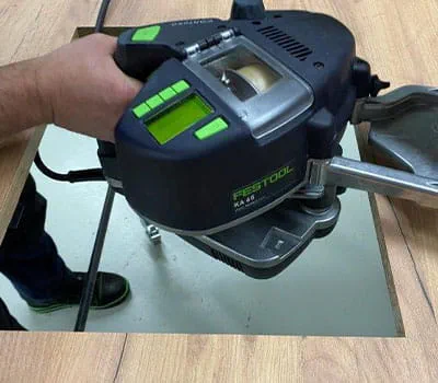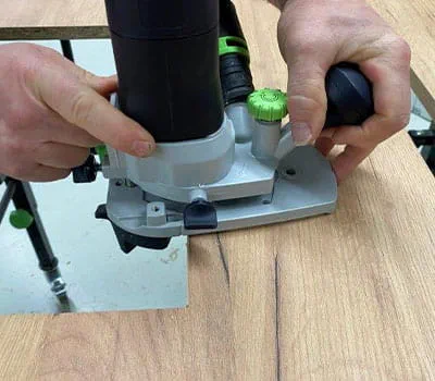 Im vorliegendem Anwendungsbeispiel erstellen wir gemeinsam eine eingelassene Revisionsklappe in einer furnierten Tischplatte, um einen Laptop direkt nach der Arbeit sauber zu verstauen und den Tisch für andere Zwecke nutzen zu können. Das Fach kann auch für andere Inlays genutzt werden. Da der Ausschnitt als Klappendeckel wieder eingebaut wird und wir nichts an der Maserung verändern möchten, muss der Schnitt rechts und links vom Sägeblatt absolut ausrissfrei sein. Die Tauchsäge mit Vorritzer hilft uns dabei.