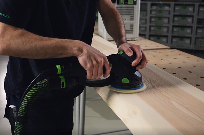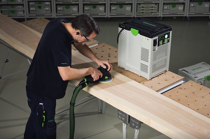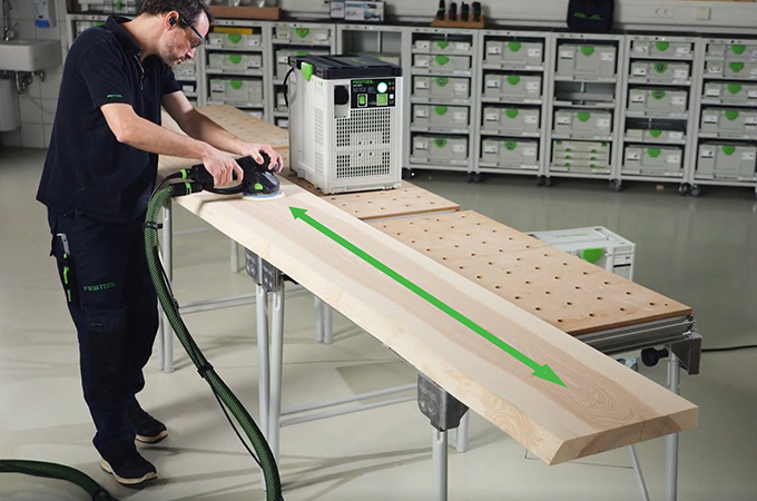 Gehobelte Holzflächen haben durch die Hobelmesser sogenannte Messerschläge oder auch Hobelschläge genannt. Diese müssen vor der Oberflächenbeschichtung geschliffen werden. Dadurch erhält man zum einen eine glatte homogenere Fläche und zum anderen hat die Oberflächenbeschichtung einen besseren Halt oder kann besser in das Holz eindringen. Wer keine große stationäre Schleifmaschine besitzt, erledigt diesen Arbeitsschritt mit Handschleifmaschinen. Der ROTEX eignet sich hier optimal, weil er Grobschliff und Exzenterschliff in einer Maschine vereint. Da diese Arbeit vor allem in der Werkstatt erfolgt, ist es von Vorteil, sich den Arbeitsplatz entsprechend gut einzurichten. Deshalb wollen wir hier auch kurz auf unser Systemzubehör eingehen.