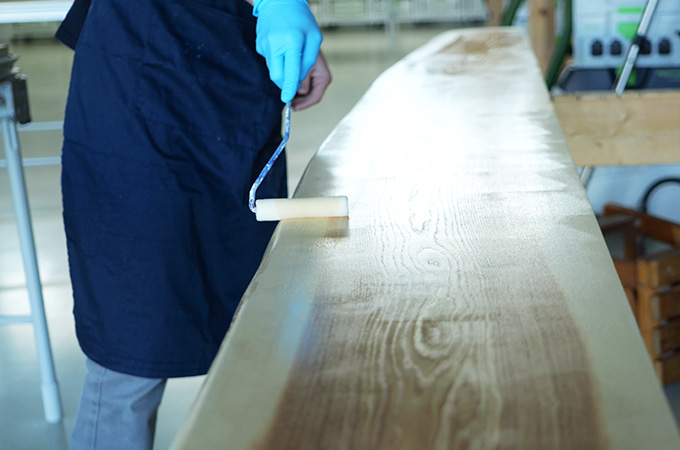 Auch diese Schleifschritte erfolgen im Kreuzschliff. Beim letzten Durchgang wird der Schleifer immer längs zur Faser geführt. Somit sind mögliche Schleifbahnen nach der Oberflächenbehandlung nicht sichtbar.