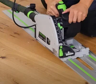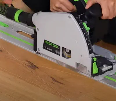 Ausgehend vom Parkettdielenstoß wird die zu reparierende Holzdiele zuerst diagonal eingeschnitten. Da die Führungsschiene am Boden nicht geklemmt werden kann, helfen die Klebepads der Führungsschiene diese verrutschsicher zu platzieren.