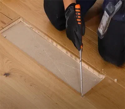 Jetzt werden die einzelnen Teile vorsichtig ausgehebelt. Bei vollflächig verklebten Böden vorsichtig mit einem scharfen Stemmeisen entfernen.