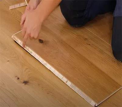 Jetzt kurz überprüfen, ob alles passt. Wenn sich die Diele komplett einlegen lässt, werden bei einer schwimmenden Verlegung Nuten und Federn beleimt und bei der vollflächigen Verklebung, Parkettklebstoff auf den Boden aufgetragen. Dann kann die neue Diele eingelegt werden. Das ganze dann noch beschweren.