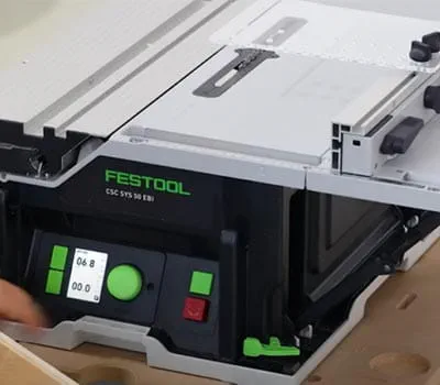 Tipp: Der Rückschlagstopp kann als Anschlag an der FS verwendet werden um nicht versehentlich über den Stoß einzuschneiden. Maschine auf der FS anlegen. Hier bitte auf die Markierung an der Säge achten, die den maximalen Austrittspunkt des Sägeblattes zeigt. So platzieren, dass die Markierung nicht über die am Boden hinausragt. Dann den Rückschlagstopp hinter der Maschine platzieren und feststellen.