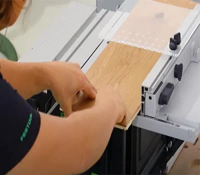 Wir starten mit der Längsseite und stellen den Parallelanschlag so ein, dass der untere Teil der Nut genau entfernt wird, sodass man die Diele später einfach nur auf die Feder auflegen kann. Dazu den Führungskeil an der Säge zum Nuten einbauen und aus Sicherheitsgründen eine Abdeckung über das Sägeblatt befestigen. (s.Bild)