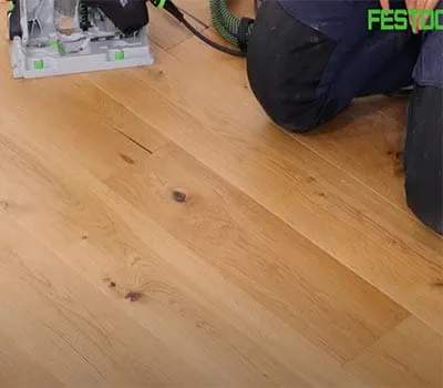Danach mit gleichem Vorgang, 10 mm von den Stoßfugen entfernt, um Nut und Feder nicht zu verletzen. An allen 4 Seiten.