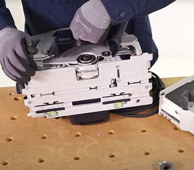 Frästiefe auf die gewünschte Tiefe einstellen. Eine Kontrolle am Anriss ist zu empfehlen. Die maximale Frästiefe beträgt mit Schiene ca. 32 mm