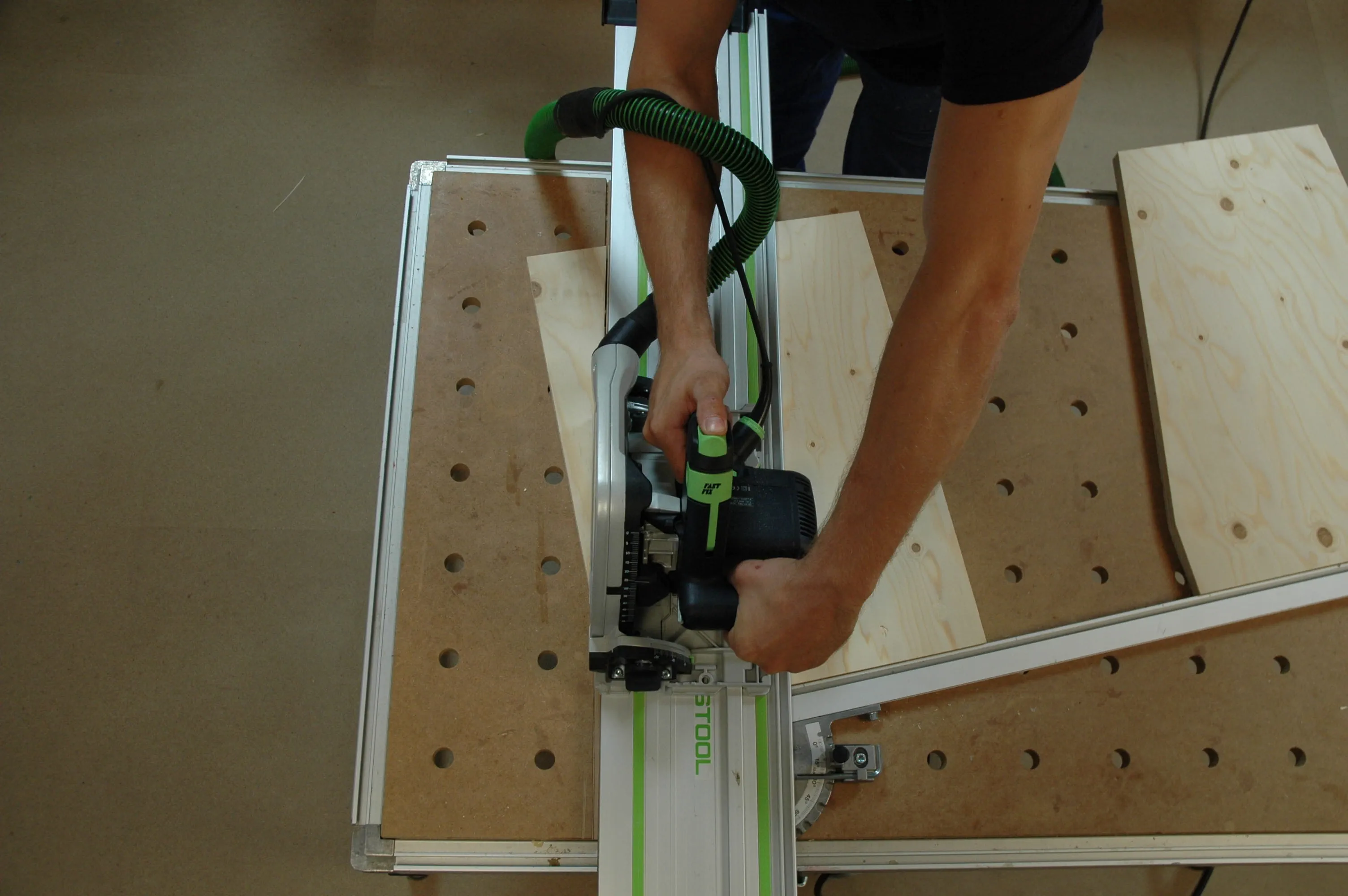 Hierbei sollte aber auf jeden Fall das passende Sägeblatt (Universal- oder Aluverzahnung) verwendet und die Drehzahl reduziert werden. Wichtig: Tragen Sie eine Schutzbrille, um Ihre Augen vor Aluminiumspänen zu schützen.