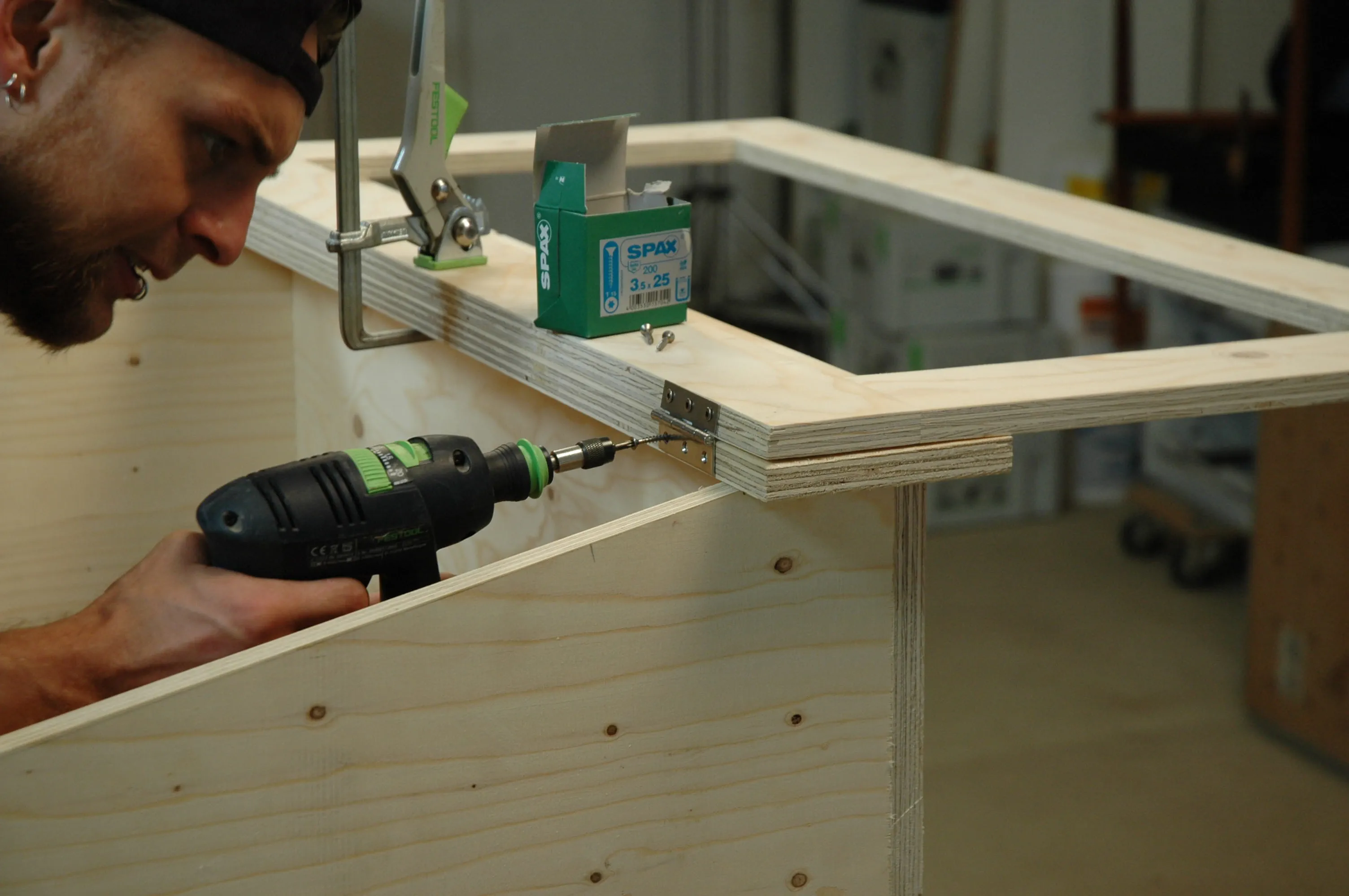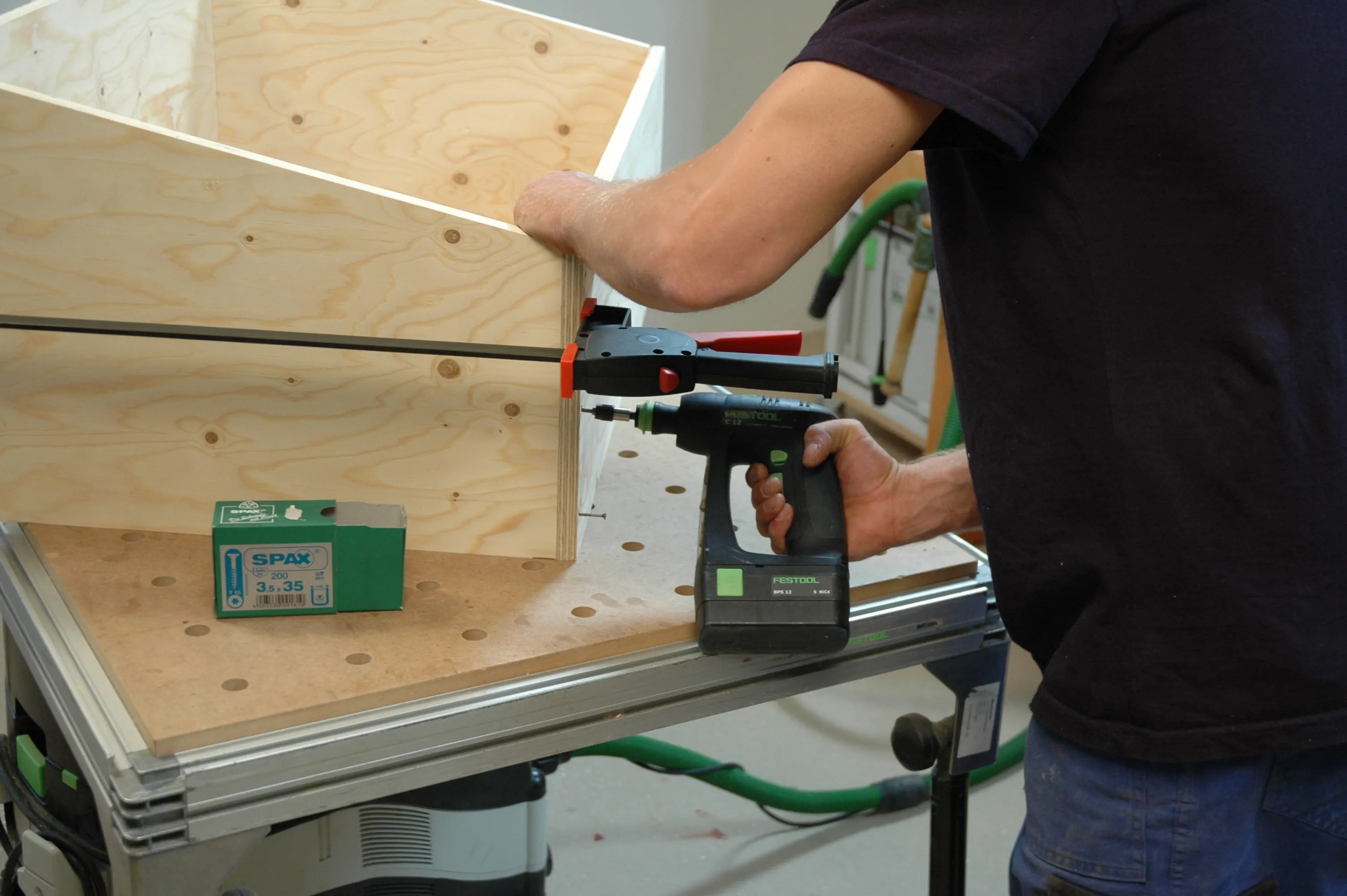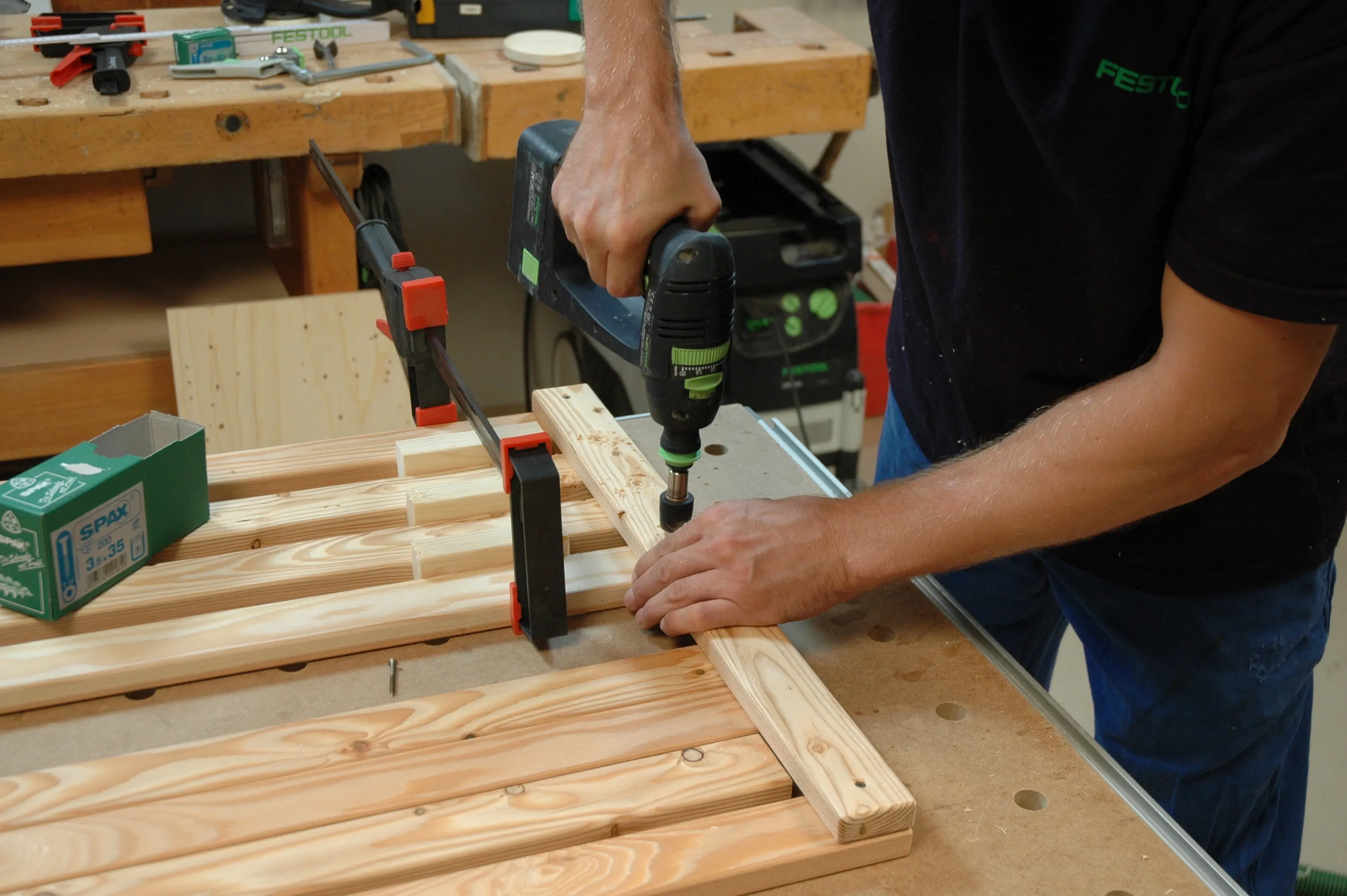 Bohren Sie in Front- und Rückwand (Pos. 1 + 2) Löcher D = 3,5 mm für die Spax-Schrauben (3,5 x 35) vor. Die vier Bretter, die den Kasten bilden, werden mit Zwingen zusammengespannt, ausgerichtet und miteinander verschraubt.