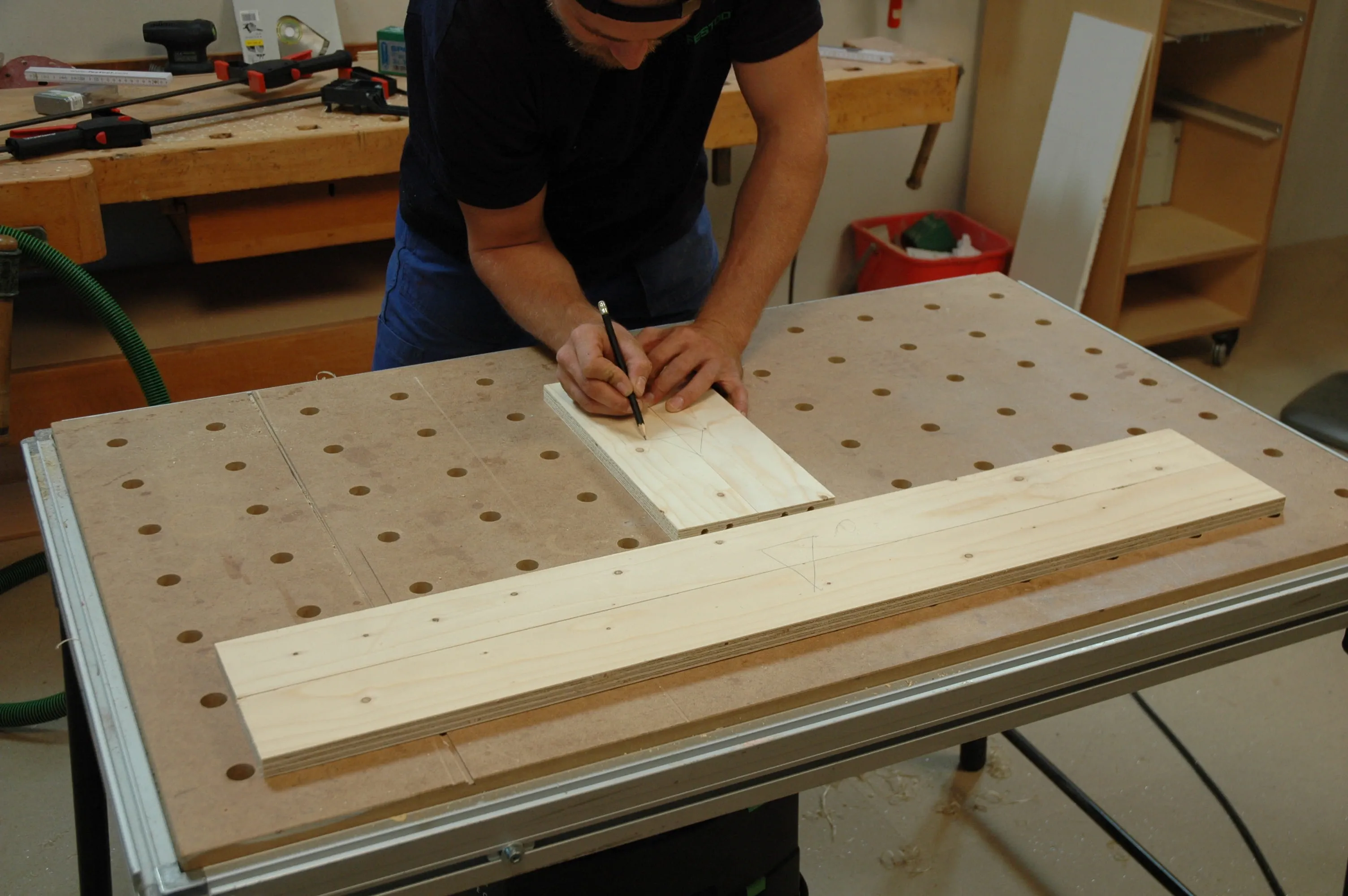 Mit dem auf dem im Bild gezeigten Multifunktionstisch können Sie die Anschlagschiene schräg stellen und das Werkstück am Tisch fest spannen. So lassen sich auch die Aluminiumprofile für die Beine zuschneiden.