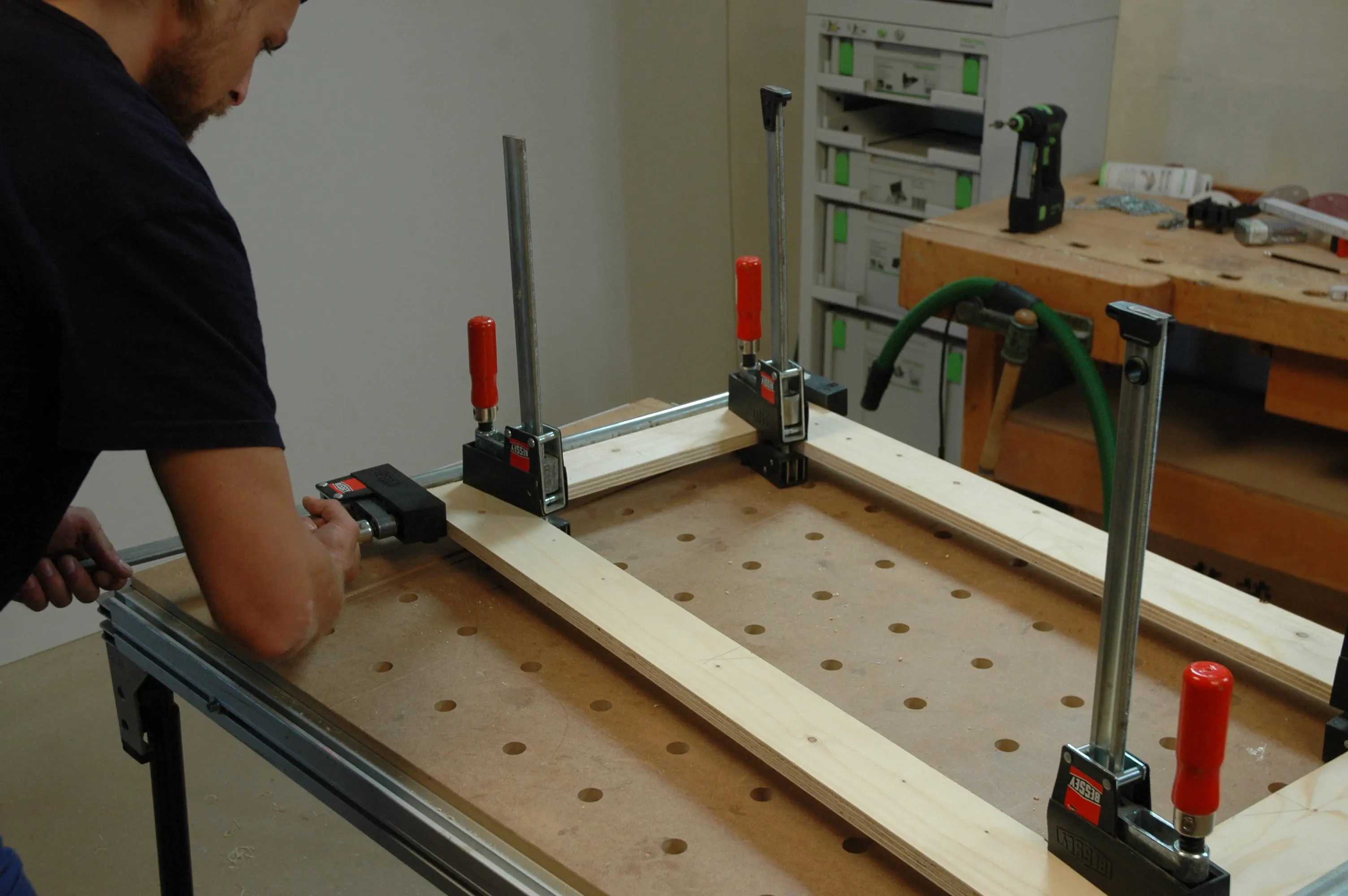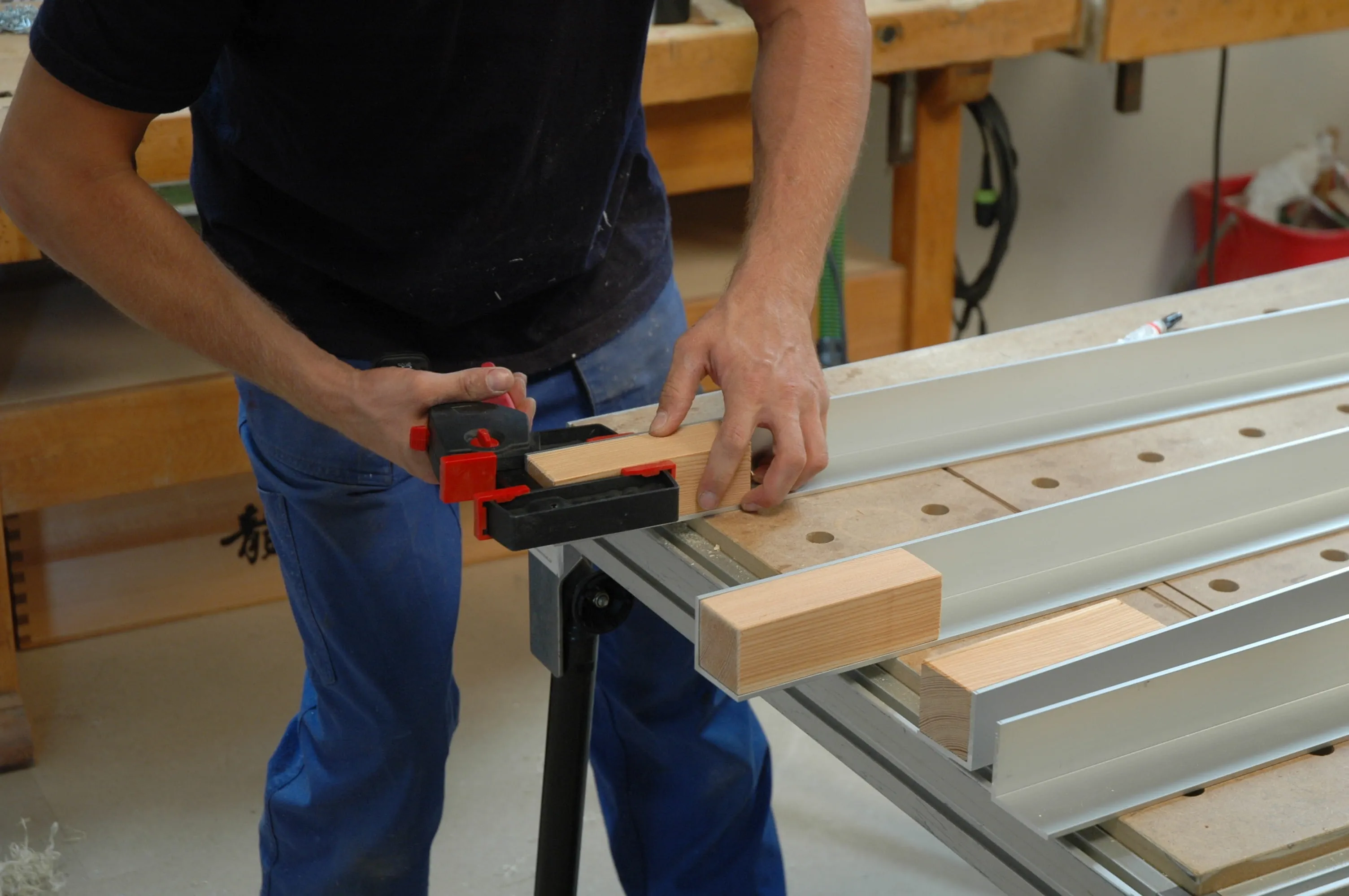 Mit den Zwingen, die senkrecht auf den Klebefugen sitzen, lassen sich leichte Ungenauigkeiten ausgleichen. Geben Sie Kleber auf die Auflageklötze (Pos. 13) und legen Sie die Klötze unten in die Beine ein. Nach dem Ausrichten werden die Klötze in beide Richtungen mit Zwingen festgespannt.
