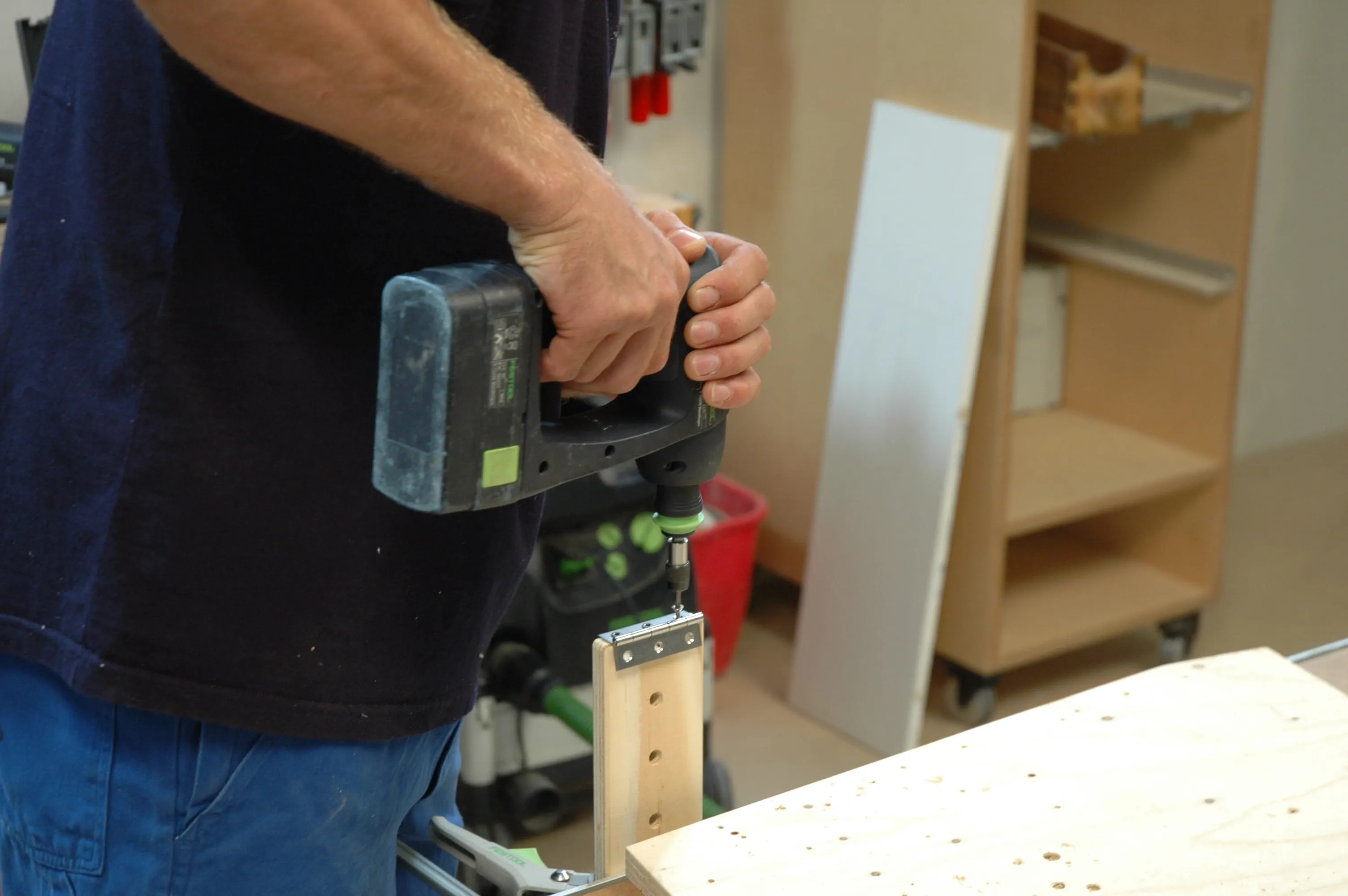 Bohren Sie in den Verschluss (Pos. 7) die Löcher (8 mm) für die Höhenverstellung der Klappe. Senken Sie die Löcher großzügig mit einem Kegelsenker. Positionieren Sie auf der oberen Schmalfläche des Verschlusses das Scharnier und richten Sie es mittig mit der langen Kante bündig an der Verschlusskante aus.