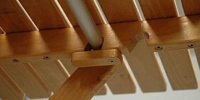 Körnung P 240 geschliffen. Danach werden noch ein bis zwei weitere Öl-schichten mit einem Lappen aufgetragen. Zum Verschrauben der Gestellteile werden Edelstahl- oder Messing-Schloss-schrauben, bzw. Maschinenschrauben verwendet. An den Stellen, wo die Mutter das Holz berührt und zwischen den beiden beweglichen Teilen des Untergestells, werden Scheiben unterlegt. Benutzen Sie Sicherungsmuttern oder