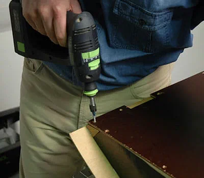 Zeichnen Sie die Position der Kulissenscharniere auf der Innenverkleidung (Pos. 17) des Daches an und schneiden Sie die Aussparungen, die die Material‑dicke der Scharniere ausgleichen, mit der Stichsäge aus. Schrauben Sie jetzt die Innenverkleidung am Dach fest. Die Verbindungslöcher (D = 4,5 mm) zwischen den einzelnen Wänden bohren und die Hütte zusammen schrauben.