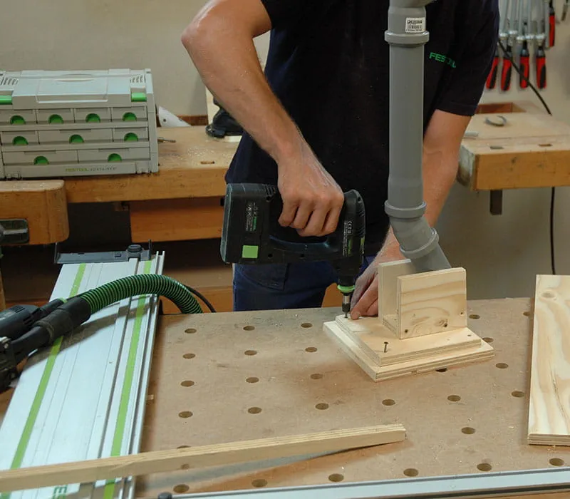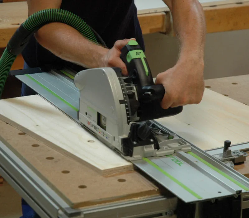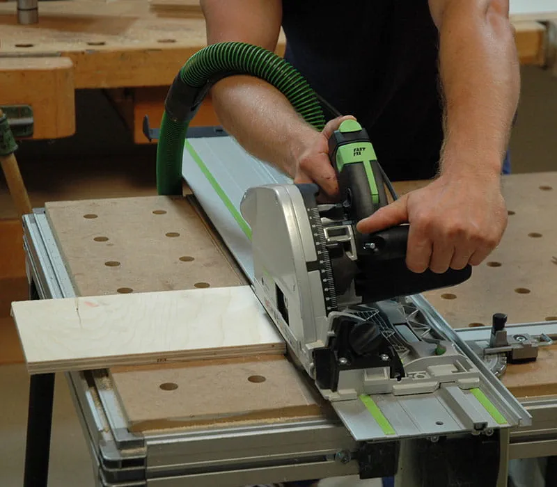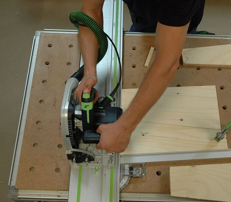 Schneiden Sie mit einer Handkreissäge mit Führungsschiene oder mit einer Tischkreissäge die Sperrholzplatten auf die in der Materialliste angegebenen Maße zu. Beim Zuschneiden mit dem auf dem im Bild gezeigten Multifunktionstisch können Sie die Anschlagschiene auf 5° schräg stellen und dadurch die Wände des Hauses einfach und exakt zuschneiden.