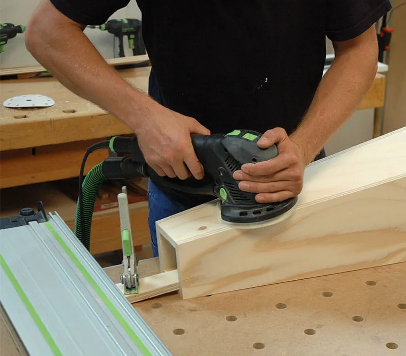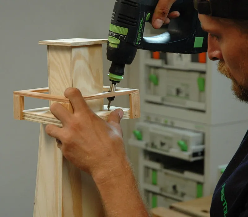 Die Außenecken des Turms können mit einer Oberfräse oder einem Handhobel abgerundet werden. Schleifen Sie dann alle Teile des Turmes mit einem Handschleifklotz und einem Exzenterschleifer.