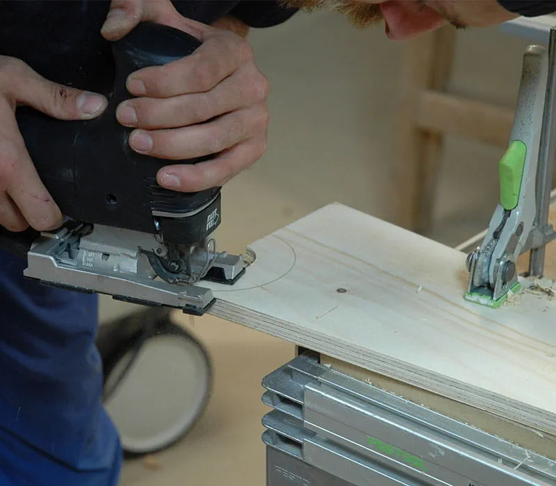 Beim Schneiden der Ober- und Unterkante der Wände (Pos. 1 + 2) wird das Sägeblatt um 5° geneigt. Es ist hilfreich, ein zweites Wandstück als Anschlag zu benutzen.