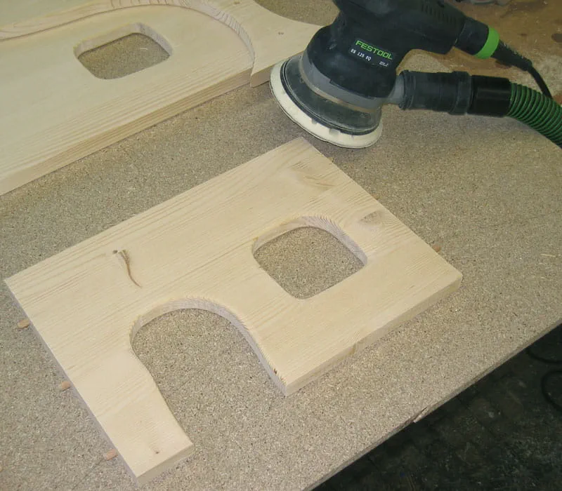 Die einzelnen Kanten schleifen und mit Hilfe einer Oberfräse oder von Hand abrunden. Schleifen der Flächen mit einem Exzenterschleifer oder von Hand.