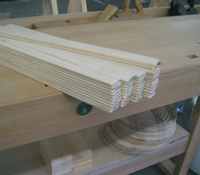 Während der Leim trocknet, die Dachleisten (Meterware im Holzhandel) fürs Dach auf Länge schneiden und die Kanten brechen.